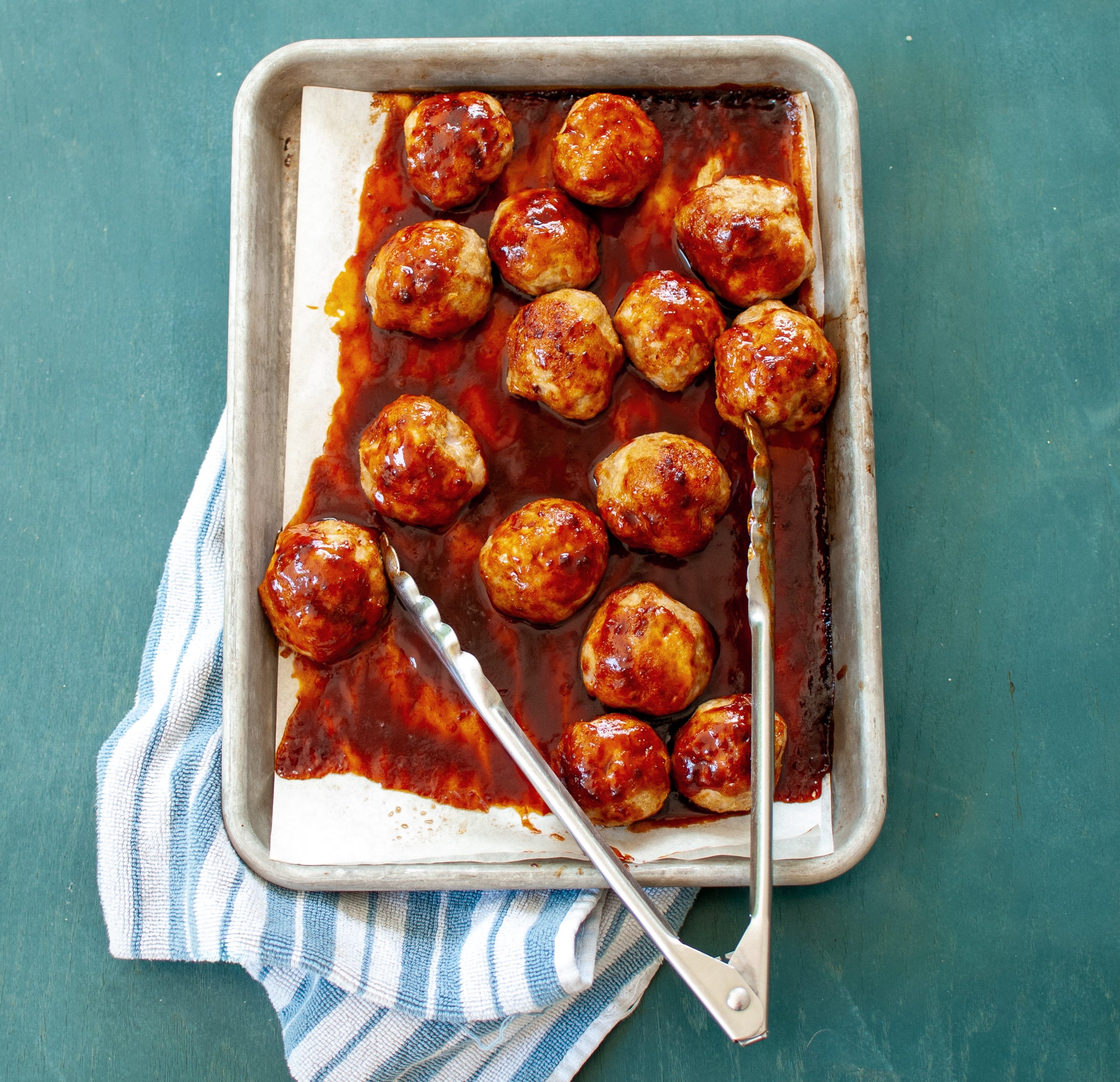When the meatballs are just firm to the touch, pour the glaze evenly over them and return them to the oven (the glaze will seem liquidy at this point and that’s okay; it will thicken in the oven). Continue to roast until the meatballs are totally firm to the touch and the glaze is nice and glossy, about 5 minutes. You can always crack one of the meatballs open to make sure it’s cooked through, if you need some reassurance!