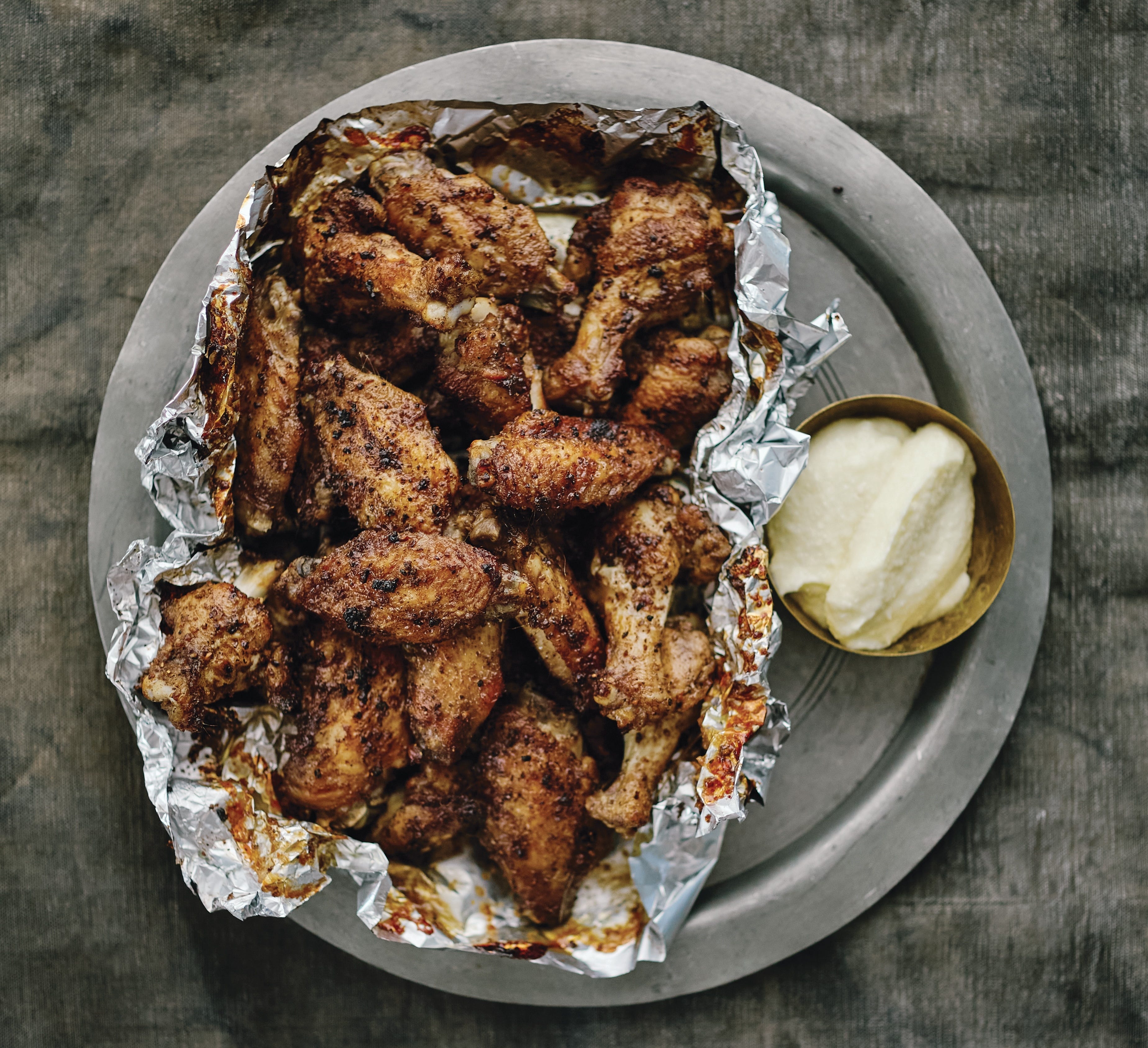 An essential part of our mezze, the wings in this recipe are always cut into two pieces, one fat drumstick-like part and the other flat. The tip end is discarded. I try to buy organic wings, and I choose them not too large. As I don’t have a barbecue, I roast them in the oven at a high enough heat so the edges crisp up as if they were grilled on a live fire. Of course, the slightly charred flavor is not there, but they cook more evenly than under the broiler and they are still extremely moreish. These make a delightful quick lunch, served alongside a salad or a dip. And, of course, they are perfect as part of a mezze spread, served with tüm (see recipe below.)