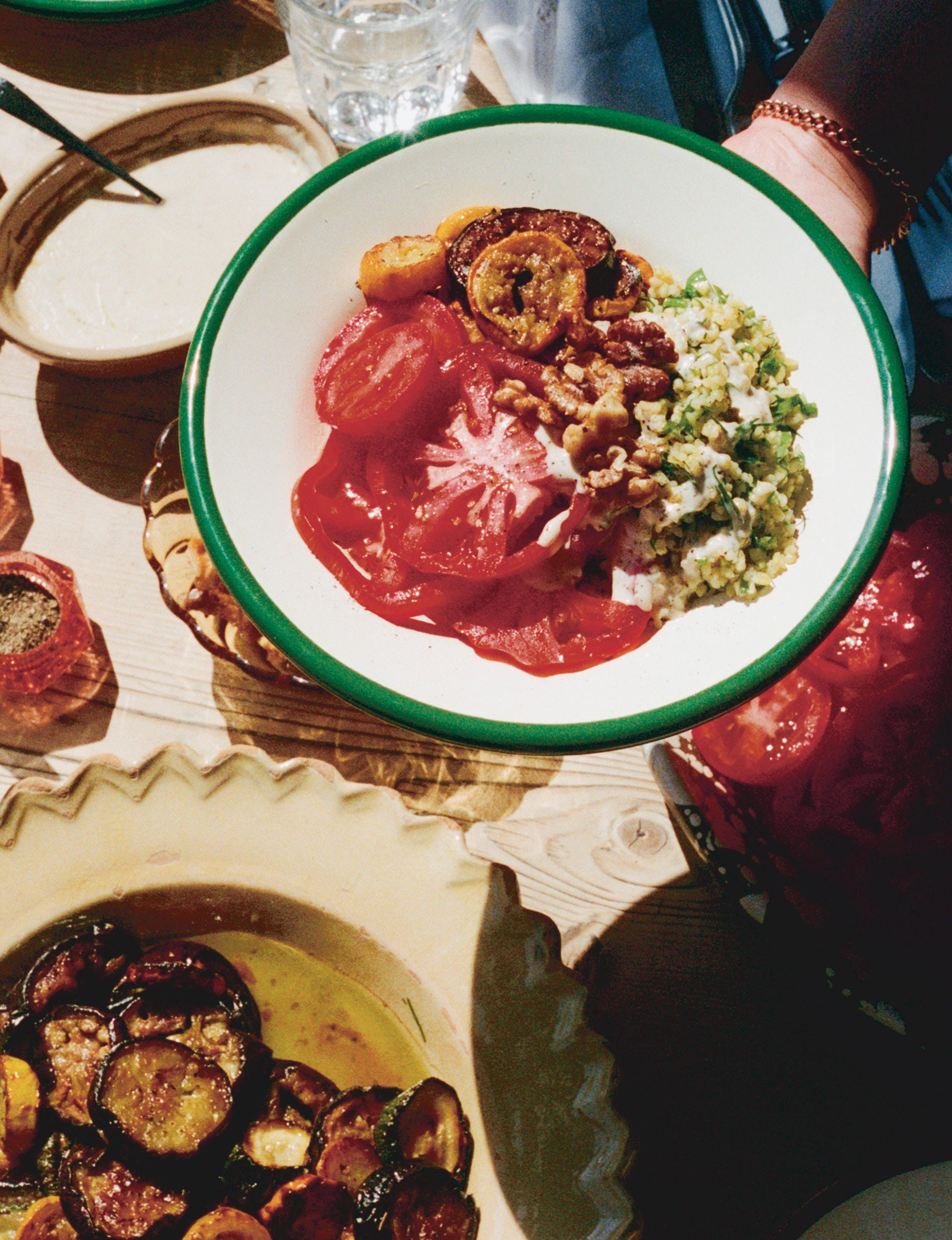 Pile your plates high with the herbed bulgur, marinated vegetables, salted tomatoes, roasted walnuts, and drizzle with tahini dressing. A splash of good hot sauce doesn’t go amiss here either, and chili oil would be a welcome addition in the warehouse.