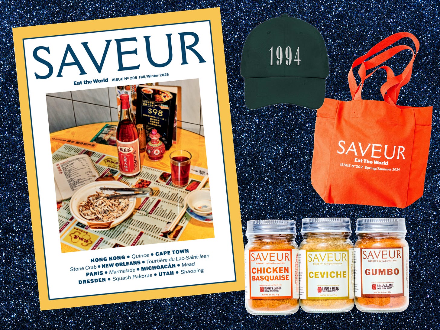 This week’s giveaway includes a copy of SAVEUR Issue 205: F/W ‘25, plus a SAVEUR Market Tote, their 1994 Hat, and a SAVEUR x Burlap & Barrel Spice Trio.